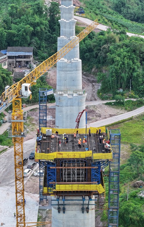 图为2024年5月16日,中铁十局的工人在西渝高铁(康渝段)站前工程十一标段四川省广安华蓥市庆华镇天龙山1号华蓥河特大桥32号桥墩上,浇筑首联连续梁0号块。(邱海鹰)