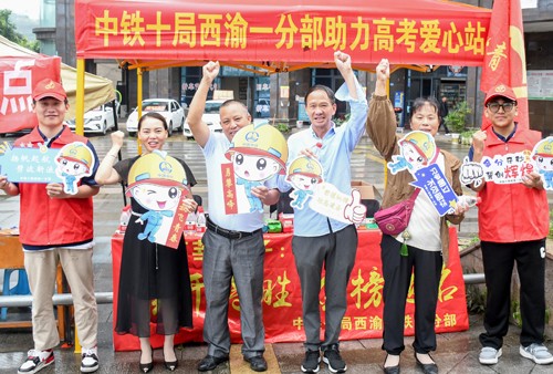 2024年6月7日,在四川省华蓥中学考点外,中铁十局西渝一分部的青年志者为参加高考的学子送去问候和祝福。