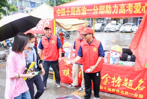 2024年6月7日,在四川省华蓥中学考点外,中铁十局西渝一分部的青年志者为参加高考的学子赠送饮用水、和文具等。(邱海鹰?刘 忠)