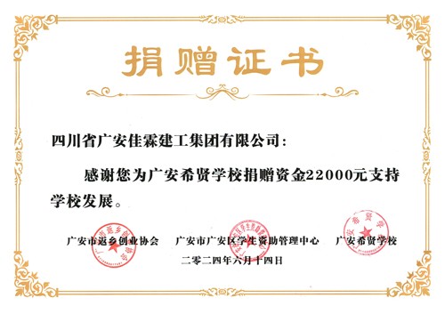 广安希贤学校向四川省广安市佳霖建工集团有限公司送上捐赠证书,共富思源显民企 担当,情系教育展无私大爱。