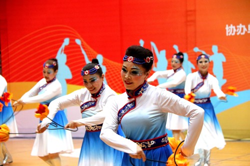 随着《我们共同的家》健身球双球操自选套路和《在希望的田野上》健身球操规定套路音乐响起,顺庆区老年人体育协会健身球分会队员充分展示了他们热爱生活的精神风貌和老有所乐的夕阳风采。伴随着欢快的健身球操乐声,她们舞动手中的健身球,时而转圈,时而跨步,敲打着身体的各处穴位,活力四射,精彩纷呈,观众喝彩声掌声不断。