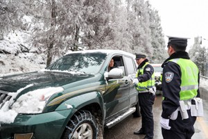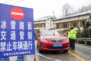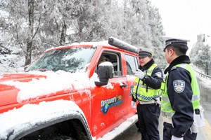 2024年1月22日,四川省广安华蓥市公安局交通警察大队的民警,冒雪在积雪结冰路段较多的交通要道天石路,严检细查往返车辆的安全情况。