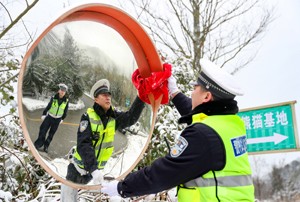 2024年1月22日,四川省广安华蓥市公安局交通警察大队的民警,冒雪在积雪结冰路段较多的交通要道天石路,清洁急弯处的反光镜。