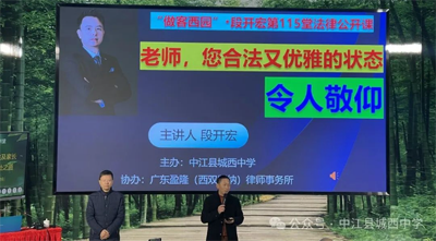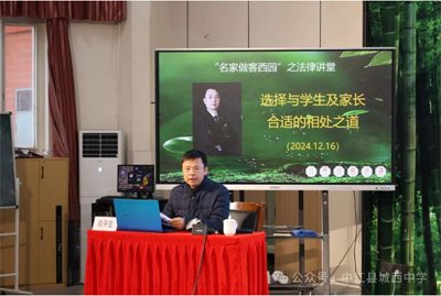 国无法而不治,民无法而不立!建设法治中国,是实现中华民族伟大复兴的重要保障。为营造良好的法治校园氛围,提高教师队伍法治素养,培养学生良好的法治观念、树立学生良好的法治意识,2024年12月16日上午,中江县城西中学教育集团特地邀请段开宏律师参加“做客西园”系列活动,并围绕“适合的相处之道”主题开展专题讲座。