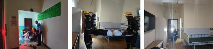 3、消防人员从应急疏散通道靠右快速到达险情位置,一组人员用干粉灭火器进行灭火,一组消防员就近打开消火栓连接消防水带灭火,一组消防人员用担架快速转移被困人员到安全指定地点。