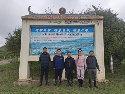 成都华宏生物科技董事长,国家沙漠治理专家李智强(左三)与科技团队在瓦切镇德香村治沙示范点调研