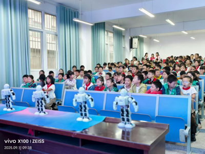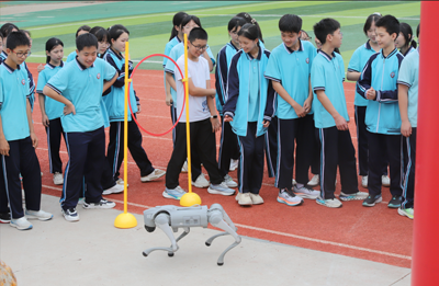 无人机编队在空中划出流畅轨迹,完成翻滚、悬停等高难度动作,引发现场阵阵惊叹;智能机器狗则以灵活的步伐完成跳跃、翻滚等动作,机器人表演和机器人人机对话与学生进行简单互动,展现人工智能技术的生动应用。五龙小学五年级二班何晨曦同学在观看机器人表演后说:“机器人太了不得,我一定好好学习,将来长大了也要研究机器人。”