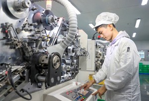 2023年2月21日,四川省华蓥市华蓥山经开区创仕鼎电子厂的员工在用智能机器赶制“订单”产品。