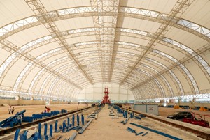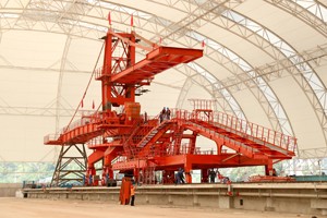 2023年9月4日,在即将全面竣工投入运行的四川首个国家级煤炭储备基地、川渝两地共建20个重大能源项目之一的广安市高兴煤炭储备基地煤棚内,建设者正在紧张安装堆取料机、传送带等设备。
