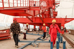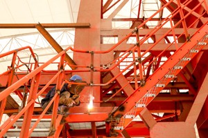 2023年9月4日,在即将全面竣工投入运行的四川首个国家级煤炭储备基地、川渝两地共建20个重大能源项目之一的广安市高兴煤炭储备基地煤棚内,建设者正在紧张焊接堆取料机。(邱海鹰)