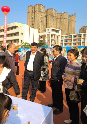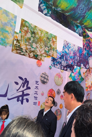 区老科协周忠勇会长陪同各位领导饶有兴趣地一一参观了各学校的科技展台,在景泰蓝掐丝、星空扎染、青花墨韵、 多彩皮影艺术工作坊前驻足停留,领导们与师生亲切交流,在互动中共享科技魅力。