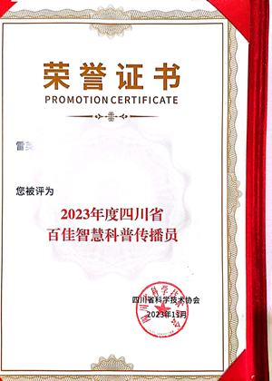 广元市旺苍县雷英获“2023年度四川省百佳智慧科普传播员”殊荣
