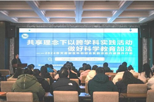 会议伊始,四川天府新区教育科学研究院科创与综合实践活动教研员满天老师为在场老师作以《共享理念下以跨学科实践活动做好科学教育加法》为主题的报告。满天老师提出我们要明确课程定位,要将赛事活动化、活动课程化、课程常态化。告诉老师们在未来的科创综合实践活动工作中要围绕一个中心,聚焦五大问题,深化四个共享,抓实十大项目。