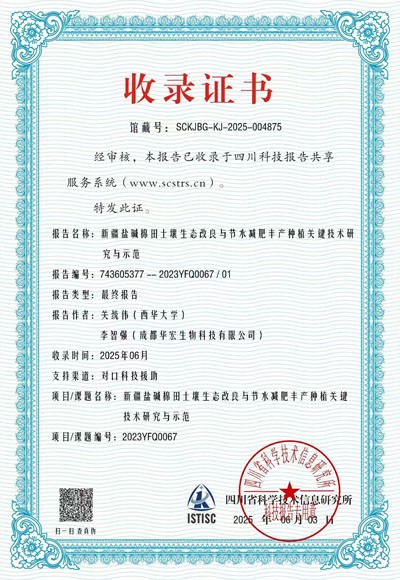 这标志着成都华宏生物科技有限公司在农业科技领域的科研实力与创新成果得到科研专业权威机构的认可与高度肯定,为新疆盐碱棉田的可持续发展注入了新的活力与动力。