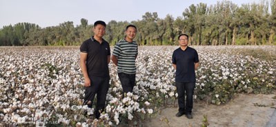 成都华宏生物科技公司董事长,全国著名沙漠盐碱地改良专家李智强(右一)和棉农享受棉花丰收喜悦