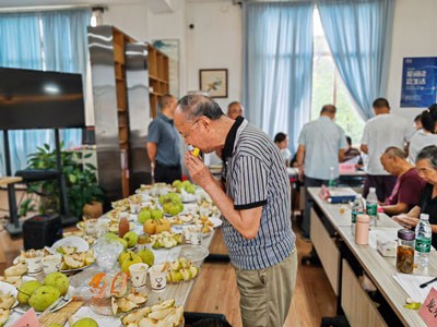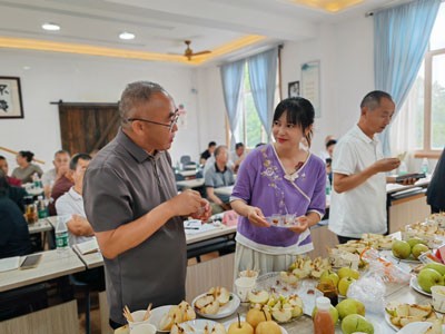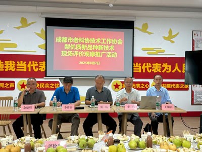 2025年8月7日,成都市老科学技术工作者协会在彭州市葛仙山镇熙玉村"仙山智理家"文创中心举办梨优质新品种新技术现场评价观摩推广活动。来自彭州、新津、龙泉驿等8个区(市)县的50余名老专家、种植户代表及农业部门负责人冒雨参会。
