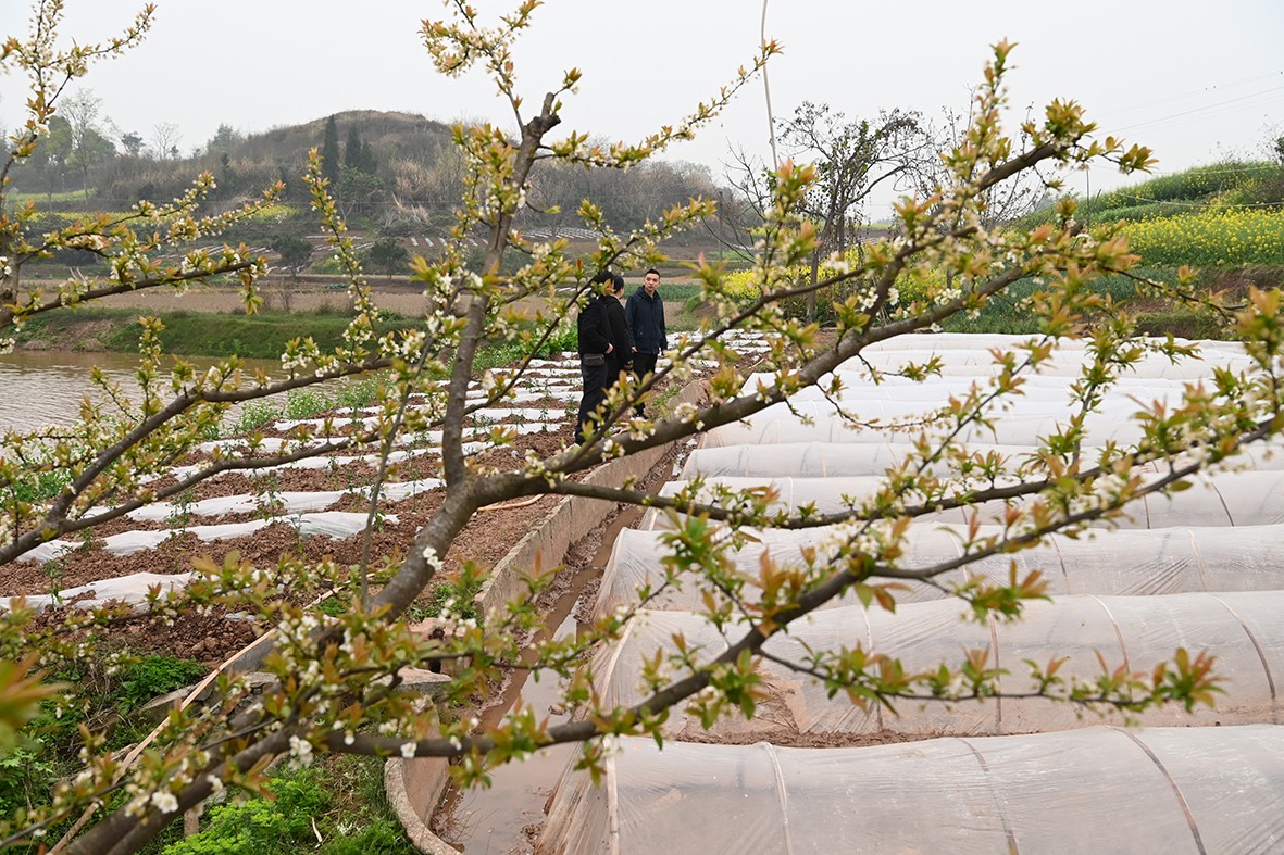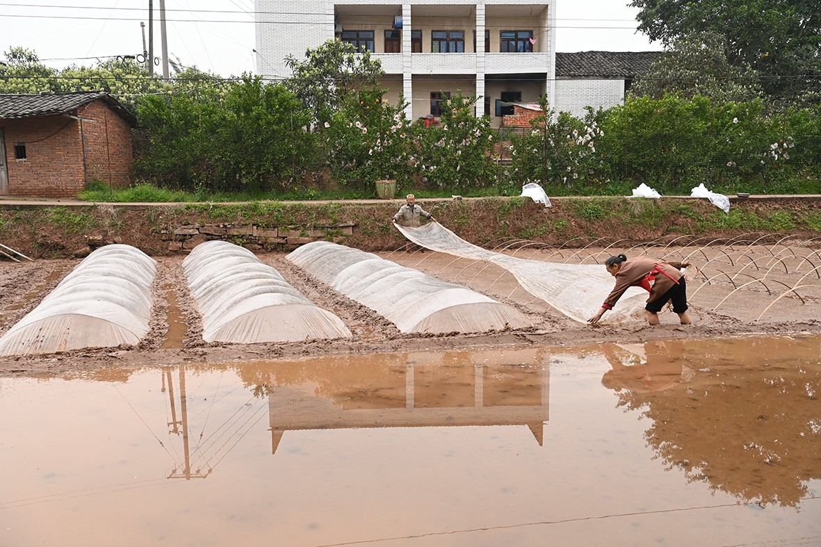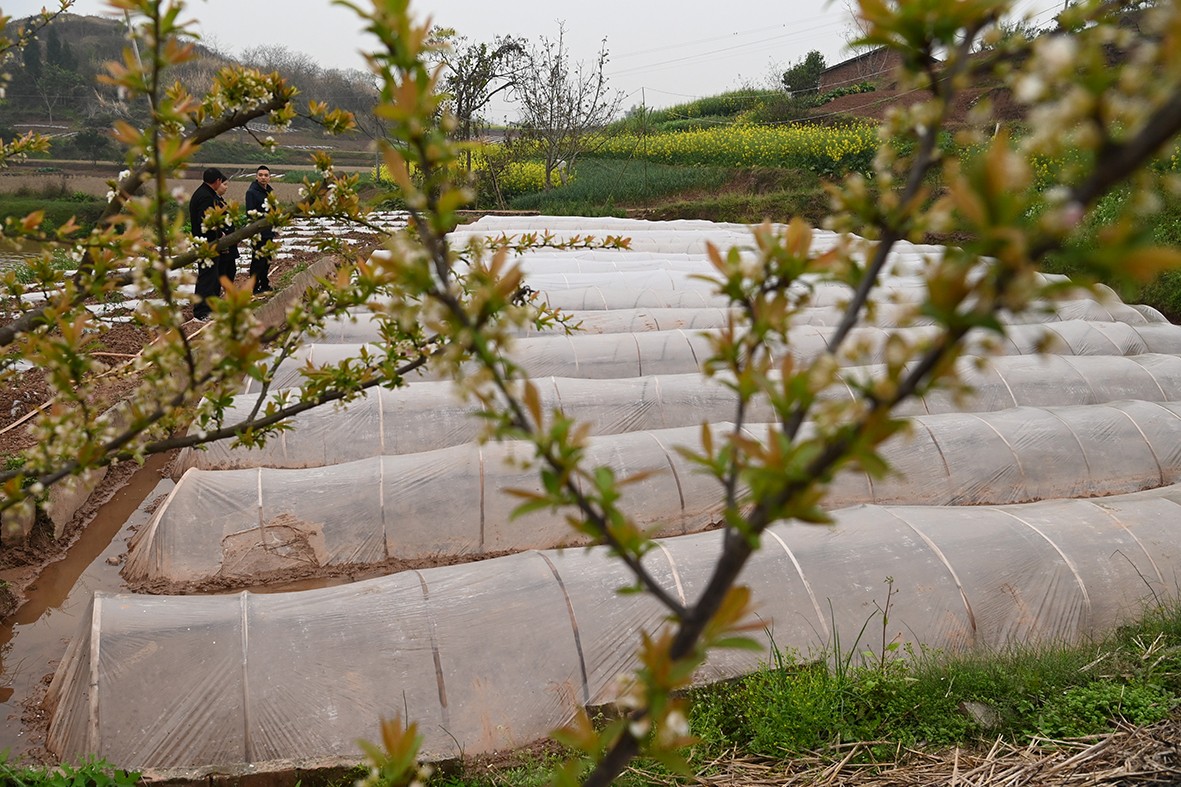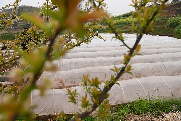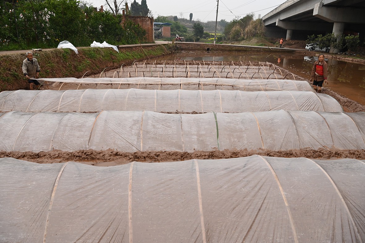 顺着田间小径前行,满目的油菜花让人目不暇接,随手用镜头记录下村民们忙碌的身影,不知不觉便来到了灯坡村。在这里,77岁的杨大爷正与老伴默契配合,为播了水稻种子的秧田搭建“小房子”。“8厢秧田我只播了3斤种子,洒得稀一点,今后秧苗才能长得更粗壮,这可是我种了一辈子地摸索出来的经验。”杨大爷一边说着,一边和老伴熟练地将一张地膜盖在竹棚上。旁边的村民们纷纷竖起大拇指,夸赞他种粮经验丰富、技艺高超。