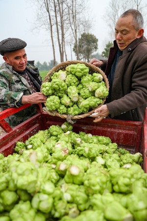2023年2月4日,四川省华蓥市永兴镇马架坪村的农民在粮经复合种植产业园, 转运订单式销往重庆等地的榨菜, 在开心中收获新年“第一桶金”。(邱海鹰)