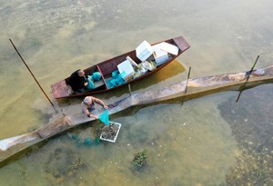 2023年2月26日,四川省华蓥市阳和镇鸽笼山村黄金白大闸蟹养殖专业合作社的社员在投放蟹苗。