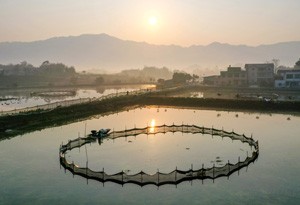 2023年2月26日,鸟瞰晨曦中的四川省华蓥市阳和镇鸽笼山村黄金白大闸蟹养殖专业合作社的养殖基地。