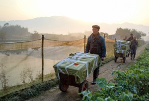 2023年2月26日,四川省华蓥市阳和镇鸽笼山村黄金白大闸蟹养殖专业合作社的社员,在转运即将投放的蟹苗。(邱海鹰 刘南贤)