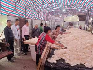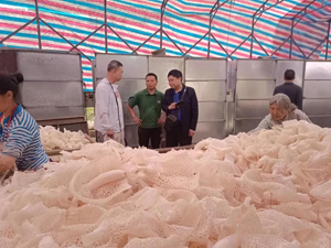 清明、谷雨正是长裙竹荪采收时节。四月十三日清早,宜宾市老科协常务副会长兼秘书长郭建华、副秘书长兼现代农业与乡村振兴专委会主任李孝轩、副主任郑君哲等一行,会同长宁县老科协会长宋亮清、常务副会长王佑明、老专家罗友清,竹荪"土专家”徐开良等,来到"营地"长裙竹荪基地之一的沙河镇群乐竹荪种植专合社调研,先后察看了郑勇生、肖本其、冉富红等竹荪种植专业户采收烘烤竹荪的情况。