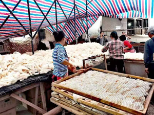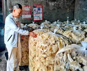 各个采收烘烤現场无不呈现一派繁忙。荪农或在大棚里精心采摘刚出土的竹荪,摘除菌盖后各自分装,白嫩嫩、胖嘟嘟好不惹人喜爱;烘烤房内,荪农有序地将鲜荪铺放在竹筛上,盖上薄膜,再放入烘烤箱;干荪则装入大口袋,准备外运。