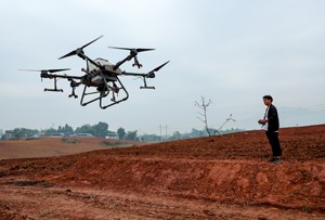 2023年11月8日,四川省华蓥市高兴镇的农民在高坪片区粮油产业园使用无人机飞播油菜种子。