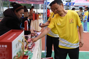 “现成的糍粑酱,吃豆花肯定方便,我买两瓶。”跑完马拉松的张正明前来购物。