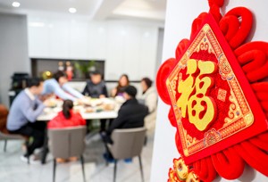 2024年1月29日,四川省广安市广安区中桥街道南苑小区一居民家中,悬挂着该市社会保险局的志愿者送来的“福”字饰品。