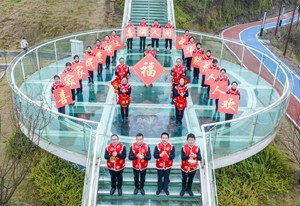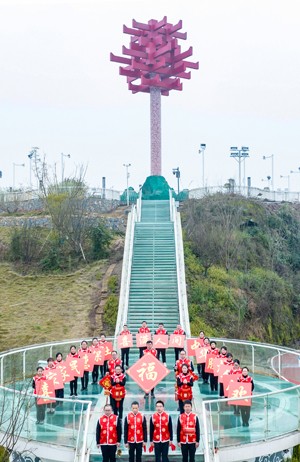 2024年1月29日,四川省广安市社会保险局的志愿者,在明月镇渠江边的“华”字碑前向全市人民送上新年的祝福。(邱海鹰)