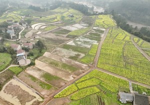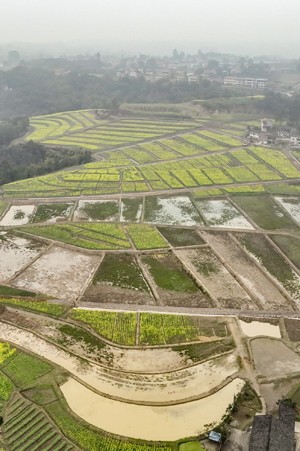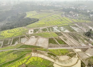 2024年3月8日,在四川省华蓥市华龙街道东方村实施的“以工代赈”项目基地,相继绽放的油菜花与即将播种水稻的农田相映成景。(邱海鹰 刘南贤)