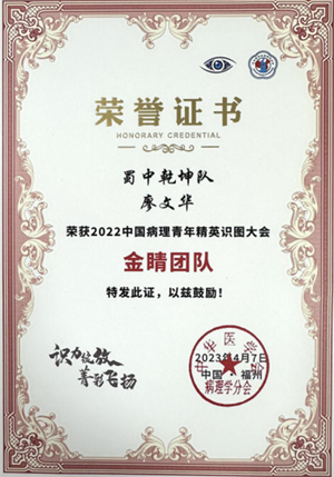 此前,在2021年6月举办的四川省青年病理识图训练营线上初赛(预备营)中,廖文华以第3名的好成绩脱颖而出,成功进入线下选拔赛,随后又历经突击营与冲锋营的重重考验,与来自省内的其他两位选手组成蜀中乾坤队,代表四川参加全国青年病理识图大会南部地区半决赛。2021年9月,南部地区半决赛以线上的方式举行,来自上海、广东等省市的30支队伍激烈争夺6个决赛名额,廖文华与队员们稳定发挥,以总分第二的好成绩成功晋级全国总决赛。