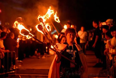 晚上8时半,火把广场独具彝族特色的歌舞演出拉开帷幕,从古老的彝族传说舞蹈,各民族和谐共处的大合唱,洋溢着青春活力的现代音乐表演:灯光秀"光影夜宴″更是將现场氛围推向高潮,通过灯光的明暗交替,色彩变幻与角度的切换,营造出奇幻多变的场景,为万余名游客带来闪亮的视觉享受。晚10点,海坪箐火晚会开始,火把广场内火盆瞬间彼点燃,熊熊列焰直冲夜空,点燃了夜幕,点燃了广场周围山头上万支火把,点燃了在广场上万游客的狂欢激情。欢快的彝族音乐响起,身着漂亮民族服饰的彝家儿女笑容滿面,