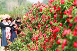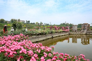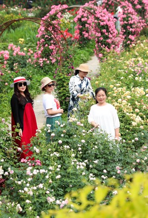 2023年4月27日,市民在四川省华蓥市禄市镇凉水井村生态观光园的特色民宿舒家大院前的玫瑰园中赏花拍照。