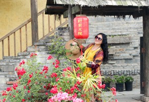 2023年4月27日,市民在四川省华蓥市禄市镇凉水井村生态观光园的特色民宿舒家大院留影。