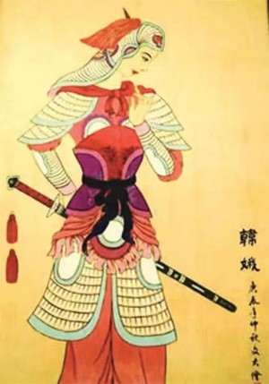 到了马家后,只见一个满脸绉纹,头发花白的五十多岁的老妪,正在厨房切菜。听说有人来,她忙迎了出来,她虽然上了年纪,但她的站姿笔挺,背不驼,腰不弯,一看就知是当过兵的人。县大老爷叫马韩氏坐下,详细询问了她的身世。韩娥不敢不敬,不敢隐瞒县令,只好将女扮男装,当兵抗敌,如何嫁到赤岸山都一一道来。