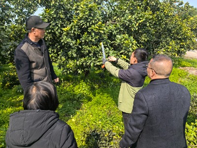 此次培训邀请富顺县农业农村局农艺师、自贡市农民夜校市级名师林迅授课。林迅结合当前天气情况重点就柑桔春季管理期的春肥施用、灌水覆土、病虫害防治、树体整理等技术要点进行了系统讲解和示范,并仔细解答果农提出的问题。随后,林迅带领大家来到李寺村果农柑桔果园开展实操教学,指导果农现场疏除过密枝、病枯枝,从而改善树冠通风透光性,调整骨干枝角度以平衡营养分配,确保技术落地落实。