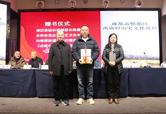 区委组织部老干部科科长肖敏、区老科协党总支书记卫志中向德源街道禹庙村赠送老科协为禹庙村编写的《禹庙村历史文化资料》书籍。