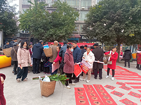 在向阳社区太阳城广场,今天恰逢逢场天,笔墨纸砚,翰墨飘香,人头攒动。老师们全神贯注,笔锋游走间,一个个饱满圆润、苍劲有力的大字跃然纸上。村民们围在书法老师们身边,兴致勃勃地观看书写过程,赞不绝口。村民拿到心怡的春联将它捧在手里,暖在心上,脸上洋溢着幸福的笑容。到临近中午,墨汁用完了,有的村民还自己去购墨汁,让书法老师们书写。