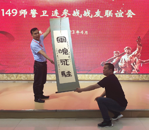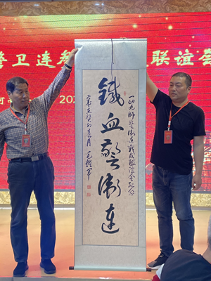 原445团司令部打字员平顶山籍毛耀军战友为增彩联谊会特意创作了“铁血警卫连”书法大作呈献联谊会。