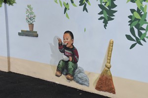 上午10时,天空下着细雨。记者走进与县交通运输局办公区域毗邻的工行小区采访看到,地面平整而且刚黑化,院坝正中和左右两侧挖出了绿化树窝子等待栽树,院坝左侧的围墙墙壁上,栩栩如生地绘制了近10幅传承文明的图画。