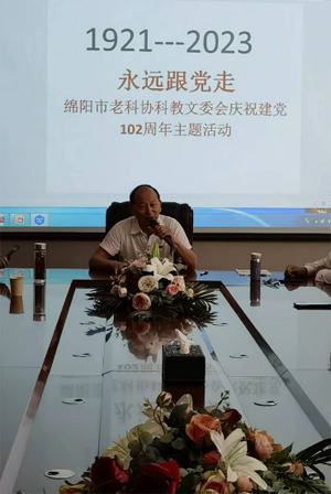 市老科协理事、科教文委员会主任左世茂首先致辞: 今天大家着装整齐,党徽在胸前熠熠生辉,我们在这里隆重集会,共同庆祝中国共产党成立102周年,弘扬党的优良传统,进一步动员协会全体共产党员,不忘初心,牢记使命,坚定信念,振奋精神,开拓进取,奋发有为,为开创绵阳市老科协事业新发展、新局面、新作为而努力工作。在此我代表科教文委员会向辛勤奋战在各条战线上的老科技工作者和全体共产党员表示节日的问候和崇高的敬意!