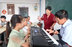 2023年7月11 日,四川省华蓥市华龙街道沙坝村退休老教师姚志菊,在她创建的“爱心驿站”给暑假中的留守儿童义务教唱歌曲。