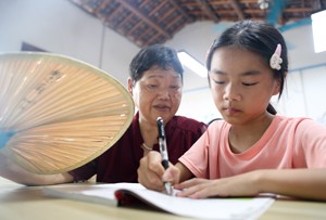 2023年7月 11日,四川省华蓥市华龙街道沙坝村退休老教师姚志菊,在她创建的“爱心驿站”给暑假中的留守儿童义务辅导学业。