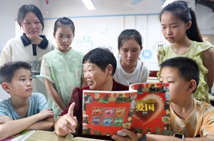 2023年7月11 日,四川省华蓥市华龙街道沙坝村退休老教师姚志菊,在她创建的“爱心驿站”给暑假中的留守儿童义务讲故事。