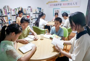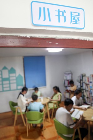 023年7月11 日,四川省华蓥市华龙街道沙坝村暑假中的留守儿童,在退休老教师姚志菊创建的“爱心驿站”“小书屋”看书。