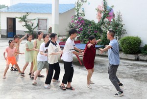 2023年7月11 日,四川省华蓥市华龙街道沙坝村退休老教师姚志菊,在她创建的“爱心驿站”与暑假中的留守儿童一起玩“老鹰捉小鸡”游戏。(邱海鹰)