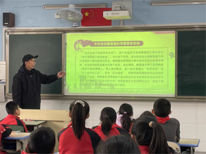 在红色传承进课堂的活动中,卫志中老师在五年级八班用课件宣讲“毛主席视察红光”郫都红色故事。